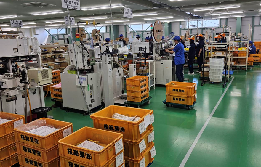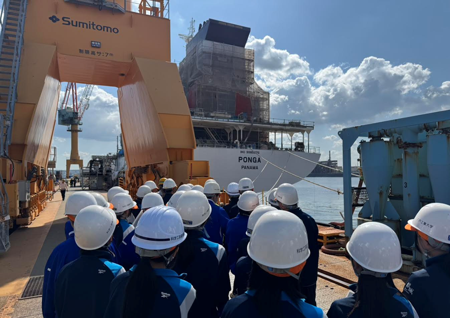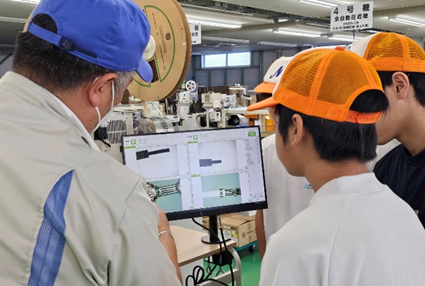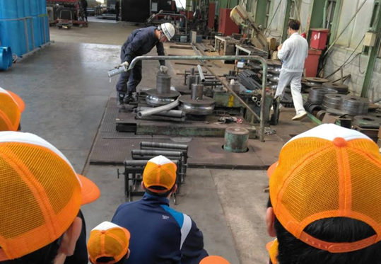 バスでの移動中に車窓から臨海工業地帯や飼料穀物コンビナートなど八戸港の臨海部の産業について学びながら、それぞれのグループが桜総業、大平洋金属、北日本造船の各工場を訪問して見学。もう1グループは北辰工業のトランポリンパークと鋼材曲げ加工工場を見学しました。