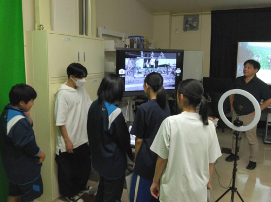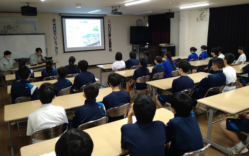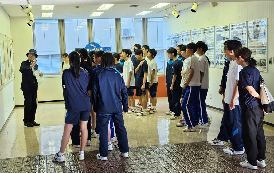 当日は2年生の生徒131名が4グループに分かれ、うち3グループが最初に八戸水産会館を訪問して展望台から漁港や工業地帯の眺望を実感すると共に、1階に展示されているパネルにて八戸市の水産業の歴史と現状に関して学習。