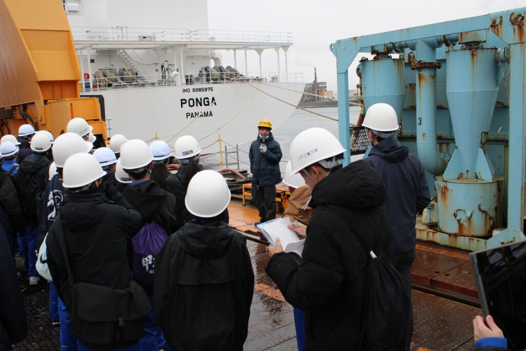 当日は初雪が舞い冷たい北風が吹く1日でしたが、2年生の生徒が2班に分かれ、車窓から八戸第1臨海工業団地・八戸飼料穀物コンビナート・八戸第2臨海工業団地・桔梗野工業団地・八戸グリーンハイテクランドなどを見学したあと、北日本造船豊洲工場と旭光通信システムを訪問、工場見学を行いました。その後、八戸工業大学に移動し、大学での学びについて説明を受けた後、学食で昼食を摂り、3班に分かれて2科目の模擬講義を受講しました。
